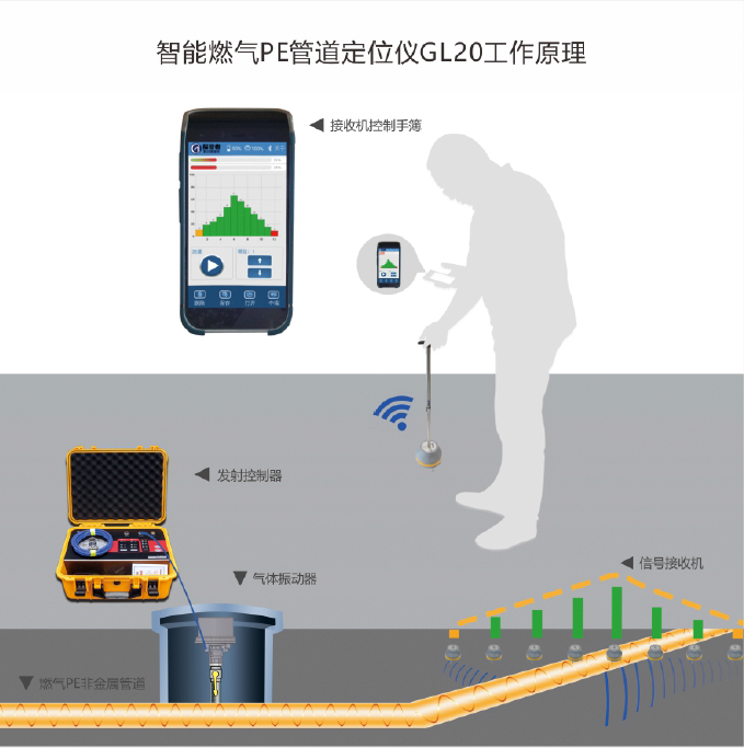 智能燃氣PE管道定位儀SL20由發射機部分相接收機部分組成,發射機部分包括發射控制器和氣體振動器 ,接收機部分包括接收機及其控制手簿和伸縮提桿。氣體振動器通過與管道放散閥連接連通到天然氣管道上