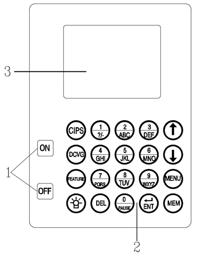 1電源開關鍵;2、鍵盤區;3、顯示屏;
